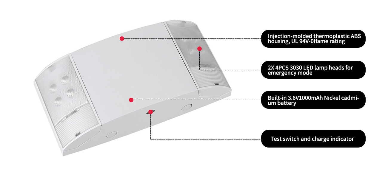 This dual head emergency light is equipped with two 4-3030 LED lamp heads, each of which can provide more than 200 lumens of brightness in emergency mode to meet basic lighting needs during power outages. The built-in 3.6V 1000mAh NiCd battery ensures a running time of at least 90 minutes in emergency use and a charging time of up to 24 hours. The product is also equipped with a test switch and charging indicator light, allowing users to monitor the device status in real time.