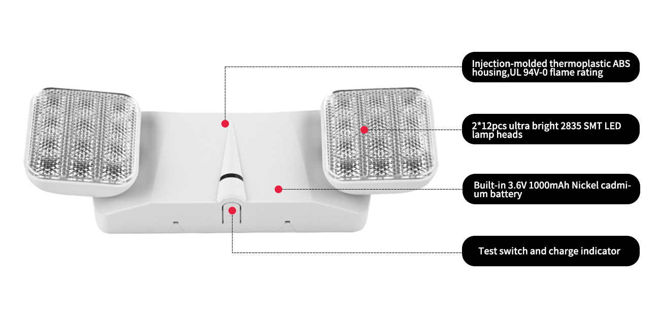 *ILLUMINATION - Emergency lamps use long-lasting, energy efficient ultra bright white LEDs. Heads are made with high-performance chrome plated reflectors and polycarbonate lenses for optimal light distribution.