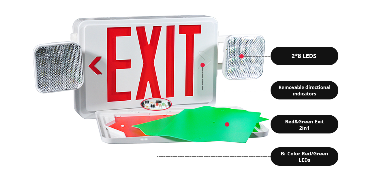 *ILLUMINATION - Emergency lamps use long-lasting, energy efficient ultra bright white LEDs. Heads are made with high-performance chromeplated reflectors and polycarbonate lenses for optimal light distribution. The LED Exit Sign series illumination is achieved by use long-lasting, efficient ultra bright red or green LEDs. Color-matched diffuser eliminates hots spots and striations, providing optimal light output.