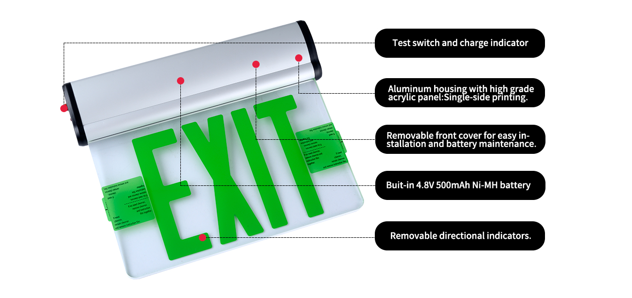 *CONSTRUCTION - This Edge Lit Exit Sign housing is constructed of die-cast aluminumhousing with an etched, clear acrylic panel. Lettering is 6" high with 3/4" stroke. Aluminum housing is standard, black and white housing available.