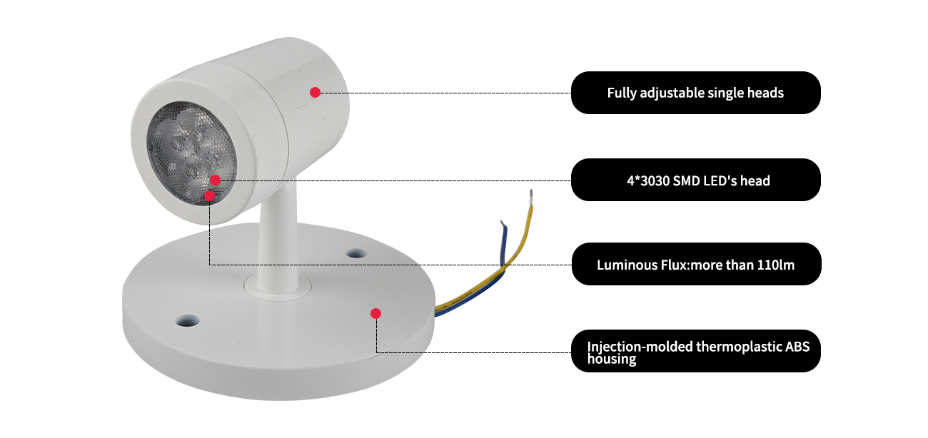 The CNDRH1 4*3030 SMD Indoor Single Remote Lamp Head is a highly flexible LED emergency light remote control lamp head designed for indoor environments, providing bright and stable lighting effects. It uses an injection-molded thermoplastic ABS shell, which is durable and has good impact resistance, suitable for various indoor places. Each lamp head is equipped with four 3030 SMD LED lamp beads with a luminous flux of more than 110 lumens, which can provide users with sufficient brightness to ensure clear lighting even in emergency situations.